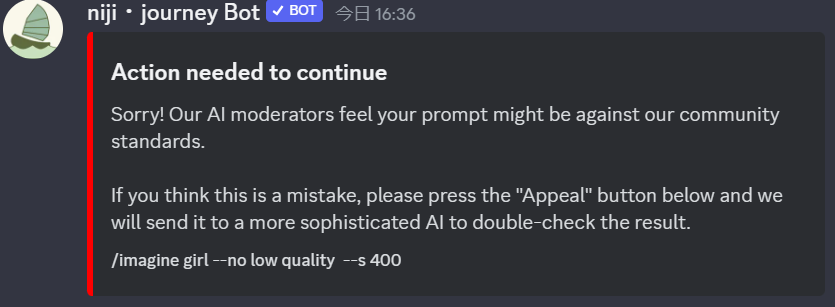 よくStable Diffusionなどで使われているlow qualityやlowres(画像や映像が品質が悪いことを表す)を使うことによってクオリティの高い画像だけを生成してくれるようになりますが、にじジャーニーで使うと以下のようなエラーメッセージが返ってきます。