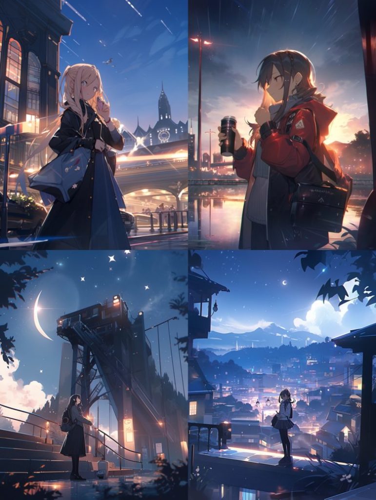 このスタイルは、背景がしっかり描写されたイラストを生成することができます。 背景のみのイラストや背景をメインテーマにしたキャライラストに特に向いています。